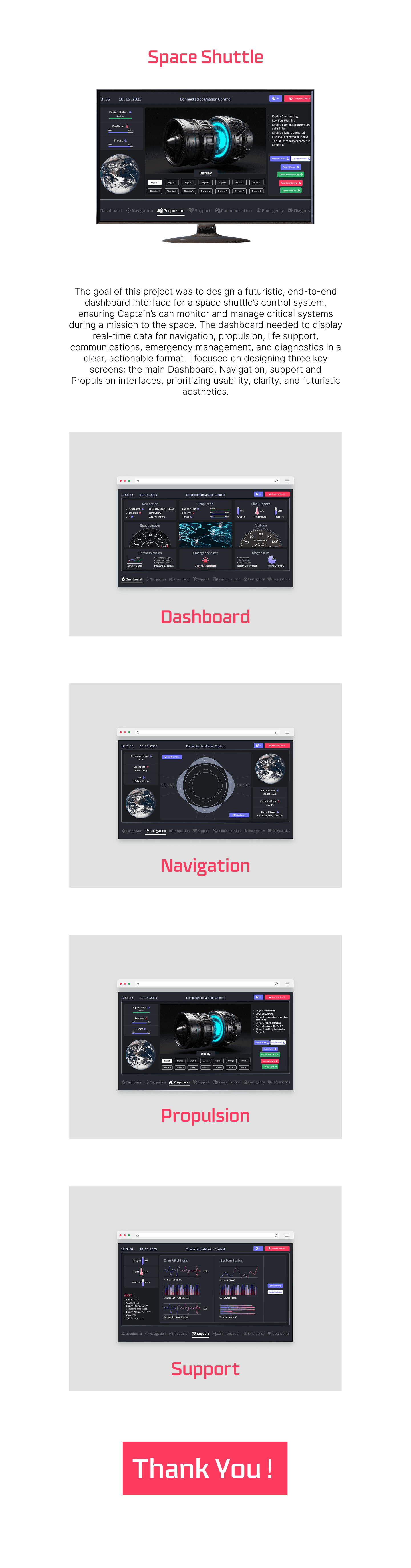 The goal of this project was to design a futuristic, end-to-end dashboard interface for a space shuttle’s control system, ensuring Captain’s can monitor and manage critical systems during a mission to the space. The dashboard needed to display real-time data for navigation, propulsion, life support, communications, emergency management, and diagnostics in a clear, actionable format. I focused on designing three key screens: the main Dashboard, Navigation, support and Propulsion interfaces, prioritizing usability, clarity, and futuristic aesthetics.